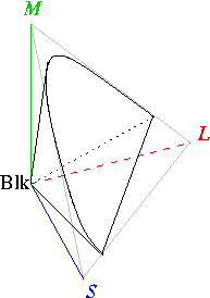 Можно определить цветовое пространство стимулов как евклидово пространство, если задать координаты x, y, z в качестве значений стимулов, соответствующих отклику колбочек длинно - волнового (L), средне - волнового (M) и коротко - волнового (S) диапазона оптического спектра. Начало координат (S, M, L) = (0, 0, 0) будет представлять черный цвет. Белый цвет не будет иметь четкой позиции в данном определении диаграммы всевозможных цветов, а будет определяться, например, через цветовую температуру, или через определенный баланс белого, или каким либо иным способом. Полное цветовое пространство человека имеет вид конуса в форме подковы (как показано на рисунке). Принципиально данное представление позволяет задавать цвета любой интенсивности - начиная с нуля (черного цвета) до бесконечности. Однако на практике человеческие рецепторы могут перенасытиться или даже быть поврежденными излучением с экстремальной интенсивностью. Поэтому данная модель не применима для описания цвета в условиях чрезвычайно высоких интенсивностей излучений, и так же не рассматривает вопросы цветовоспроизведения в условиях очень низких интенсивностей (поскольку у человека задействуется иной механизм восприятия через палочки).