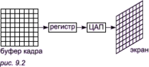 Чаще всего для графических устройств с растровой ЭЛТ используется буфер кадра. Буфер кадра представляет собой большой непрерывный участок памяти компьютера. Для каждой точки или пикселя, в растре отводится как минимум один бит памяти. Эта память называется битовой плоскостью. Для квадратного растра размером 512 * 512 требуется 218 = 5122 = 262144 бита памяти в одной битовой плоскости. Изображение в буфере кадра строится побитно. Из - за того, что бит памяти имеет только два состояния, имея одну битовую плоскость, можно получить лишь черно - белое изображение. Битовая плоскость является цифровым устройством, тогда как растровая ЭЛТ - аналоговое устройство, для работы которого требуется электрическое напряжение. Поэтому при считывании информации из буфера кадра и ее выводе на графическое устройство с растровой ЭЛТ должно происходить преобразование из цифрового представления в аналоговый сигнал. Такое преобразование выполняет цифро - аналоговый преобразователь (ЦАП). Каждый пиксель буфера кадра должен быть считан и преобразован, прежде чем он будет отображен на растровой ЭЛТ. На рис. приведена схема графического устройства с черно - белой растровой ЭЛТ, построенного на основе буфера кадра с одной битовой плоскостью.