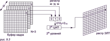 Цвета или полутона серого цвета могут быть введены в буфер кадра путем использования дополнительных битовых плоскостей. На рис. показаны схема буфера кадра с N битовыми плоскостями для градаций серого цвета. Интенсивность каждого пикселя на ЭЛТ управляется содержимым соответствующих пикселей в каждой из N битовых плоскостей. В соответствующую позицию регистра загружается бинарная величина (0 или 1) из каждой плоскости. Двоичное число, получившееся в результате, интерпретируется как уровень интенсивности между 0 и 2N-1. С помощью ЦАП это число преобразуется в напряжение между 0 (темный экран) и 2N-1 (максимальная интенсивность свечения). Всего можно получить 2N уровней интенсивности. Рис. иллюстрирует систему с тремя битовыми плоскостями для 8 (23) уровней интенсивности. Для каждой битовой плоскости требуется полный объем памяти при данном разрешении растра: например, буфер кадра с тремя битовыми плоскостями для растра 512 * 512 занимает 786432 (3 * 512 * 512) битов памяти.