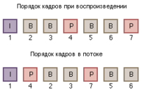 оскольку B-кадры ссылаются как назад, так и вперед по последовательности, то для оптимизации процесса воспроизведения кадры в потоке перераспределяются следующим образом: компенсация движения является методом увеличения степени сжатия Р - и В - кадров путем использования информации из предыдущих кадров. Этот алгоритм действует на уровне макроблоков и обеспечивает примерно трехкратное сжатие по сравнению с I-кадрами. Сжатый с его использованием кадр содержит дополнительно вектор перемещения макроблока, на который имеется ссылка и отличия между кодируемым макроблоком и макроблоком по ссылке. Обычно не вся информация в кадре может быть эффективно описана методом компенсации движения. В подобном случае макроблок, не имеющий анологов в предыдущих кадрах, кодируется так же, как и все макроблоки в I-кадре.