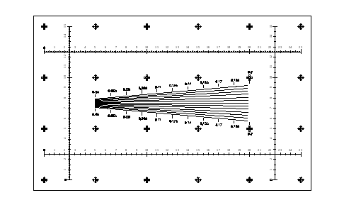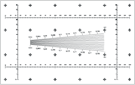 Расширяющийся растр в центре шаблона предназначен для контроля разрешения, матрица окружностей на поле шаблона - для контроля совмещаемости