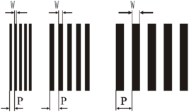 а практике разрешающая способность определяется по предельному числу линий, воспроизведенных на 1 мм длины изображения. Типовым тестовым объектом микролитографии является решетка с одинаковыми прозрачными и непрозрачными полосами (линиями) (рис. 6). В этом случае разрешение эквивалентно пространственной частоте