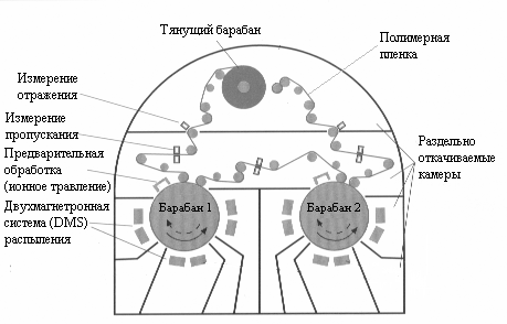 Кроме теплозащитных покрытий на стекле нанесением тонких пленок в вакууме получают отражающие и антиотражающие покрытия на полимерной пленке, например, для теплиц и оранжерей. Схема вакуумной установки для нанесения тонкопленочных покрытий на полимерную пленку, работающей по принципу “roll-to-roll”, показана на рис.6.