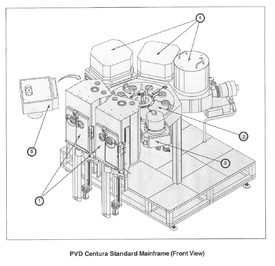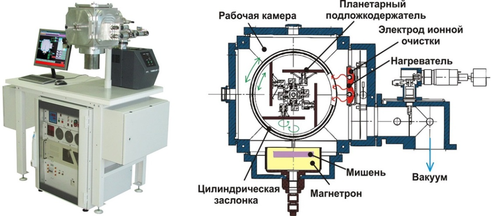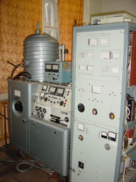 Рабочие камеры нанесения пленок снабжены магнетронными распылительными устройствами (МРУ) мультикатодного типа. МРУ содержит три катода с мишенью диаметром 100 мм. Вакуумная система установки собрана на базе криогенных насосов НВК-3.2А-Р. На установке реализуется технологический процесс нанесения четырехслойных пленок Тi- ТiN - Аl -ТiN в едином вакуумном цикле. Предварительно пластины диаметром 150 мм нагреваются до 573 К в камере очистки. Образование реактивной газовой среды для нанесения пленокТiN осуществляется в течение 15 с. Неравномерность толщины слоев Тi иТiN на пластинах составляет ±5%. Время нанесения каждого слоя составляет 15 - 30 с. Уровень привносимой дефектности обрабатываемых изделий составляет 0,15…0,25шт/см2 с размером МДЧ 0,2 мкм и менее, что соответствует лучшим зарубежным достижениям.