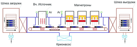В настоящее время для массового производства многослойных покрытий на поверхности большого размера, например, архитектурных стекол, наиболее оптимальным с точки зрения качества получаемого покрытия является использование вакуумных автоматических линий.