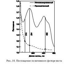Чтобы протекала фотохимическая реакция, энергия фотонов должна быть достаточной для разрыва связи между атомами. На спектре поглощения (рис. 9) это явление проявляется в виде максимумов поглощения: один на длине волны