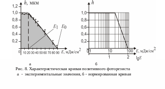 По мере увеличения экспозиции толщина слоя фоторезиста, остающегося после проявления, уменьшается (рис. 8, а). Зависимость, связывающая остаточную толщину этого слоя с величиной экспозиции (обычно ее логарифмом) называется характеристической кривой (рис. 8, а).