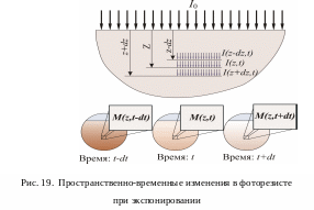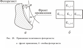 (рис.20, а). Проявление начинается с верхней поверхности пленки фоторезиста. Предварительно каждой ячейке рассматриваемого объема в зависимости от степени деструкции в ней ингибитора присвоена соответствующая скорость проявления.