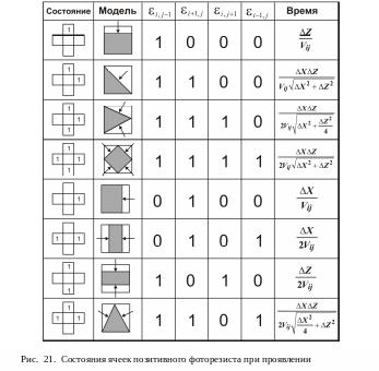 Моделирование фронта проявления осуществляется последовательно, шаг за шагом. Интервал приращения времени рассчитывается исходя из максимальной скорости проявления в ячейках