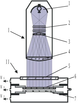 Источник излучения помещают в фокусе рефлектора, собирающего большую часть общего потока источника, увеличивая эффективность осветителя. Далее световой поток попадает в систему, состоящую из двух блоков линзовых растров 2, представляющих собой наборы микролинз, выполненных литьем или прессованием на одной из сторон стеклянной пластины. Применение блоков линзовых растров, создающих многократно повторенные изображения источника света, позволяет уменьшить влияние дифракционных явлений, возникающих из-за наличия микрозазора между шаблоном и подложкой. Контактное фотокспонирование производится параллельным пучком лучей, поэтому в осветителе используется конденсор, состоящий из двух линз 3 и 4, для коллимирования потока лучей, выходящего из второго растрового блока. Таким образом, достигается равномерное освещение при экспонировании подложки.