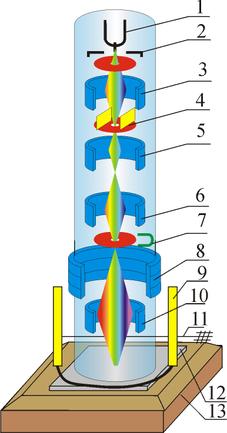 1 - Термокатод, 2 - Электрод источника, 3 - Система конденсорных линз, 4 - Система запирания и ограничивающая апертура, 5 - Первая фокусирующая линза, 6 - Вторая фокусирующая линза, 7 - Заготовка, генерирующая изображение и ограничивающая апертура, 8 - Трехуровневая система отклонения луча, 9 - Лазерный сенсор высоты шаблона, 10 – Объектив, 11 - Электрометрический усилитель, 12 – Фотошаблон, 13 - Предметный стол.