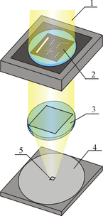 установках проекционной фотолитографии изображение шаблона проецируется оптической системой на рабочую поверхность подложки в масштабе 1 : 1 или с уменьшением. Контакт подложки с фотошаблоном и его износ при этом исключаются, что позволяет снизить дефектность топологических слоев БИС и СБИС и повысить выход годных структур ИС не менее чем в 2-3 раза.