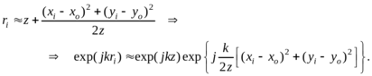 Таким образом, когда расстояние z достаточно велико по сравнению с размерами объекта и изображения, можно использовать приближения Френеля. При этом сферическая волна вторичного источника заменяется параболической, а коэффициент наклона