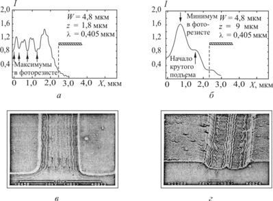а, б — расчетные кривые; в, г — микропрофили в фоторезисте