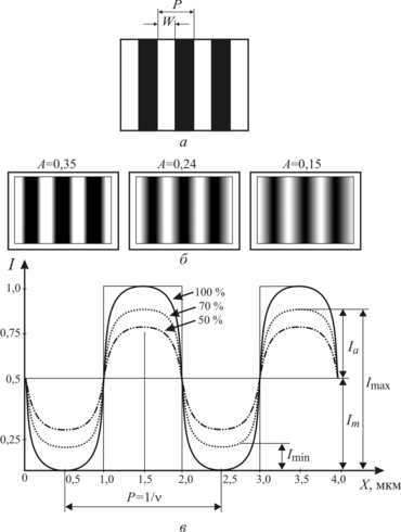 Качество пространственного изображения фотошаблона после прохождения оптической системы существенно зависит от апертуры. Чем меньше апертура объектива, тем более размытым и менее четким получается формируемое им изображение. Распределение интенсивности в изображении является уже не прямоугольным, а скорее колоколообразным. В области прозрачного окна фотошаблона интенсивность, как правило, не равна номинально заданной, а в области тени она не равна нулю (рис. 7.1, б).