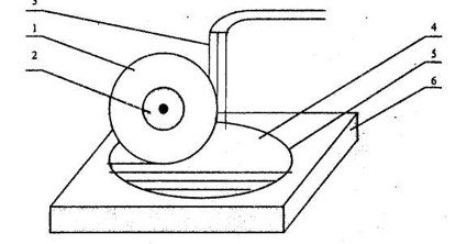 На рисунке показана схема резки полупроводниковой пластины диском с наружной алмазной режущей кромкой. Диск 1 устанавливается на шпинделе станка и зажимается с двух сторон фланцами 2. В процессе резания алмазный режущий диск вращается с большой скоростью и охлаждается жидкостью 3. Разрезаемую полупроводниковую пластину 4 закрепляют клеящей мастикой 5 на основание 6.
