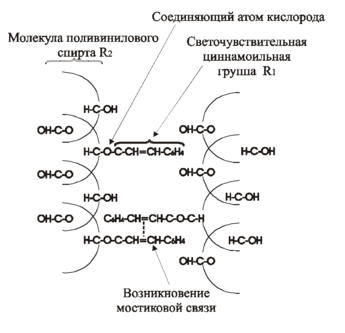 При поглощении квантов облучения наиболее слабые в светочувствительных частях молекул связи СН=СН разрываются. За счет освободившихся связей происходит поперечное сшивание молекул в химически стойкую трехмерную сетку.