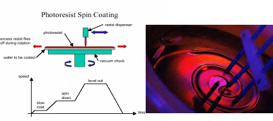 Нанесение слоя резиста на кремниевую заготовку чаще всего осуществляется центрифугированием. При включении центрифуги жидкий фоторезист растекается под действием центробежных сил. Прилегающий к подложке граничный слой формируется за счет уравновешивания центробежной силы и силы сопротивления. Толщина слоя прямо пропорциональна вязкости раствора фоторезиста и обратно пропорциональна числу оборотов центрифуги.