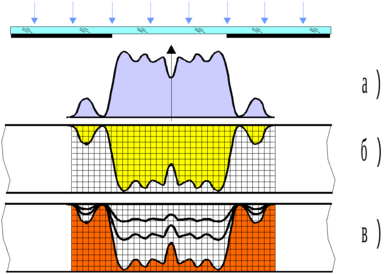 1. При экспонировании оптическое излучение, прошедшее сквозь фотошаблон, несет в себе информацию о топологии в виде распределения интенсивности излучения. В результате на поверхности фоторезиста формируется оптическое изображение фотошаблона (рис. 1, а).