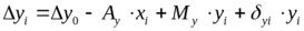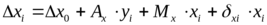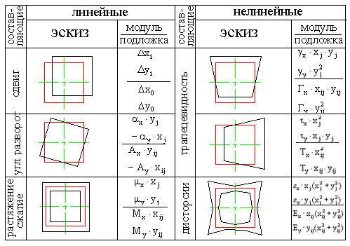 В погрешностях Хi, Уi можно выделить ряд составляющих. В их число входят общий для всех модулей сдвиг Хо, Уо, угловые развороты Ах, Ау и искажения совмещаемых слоев, характеризуемые коэффициентами Мх, My.