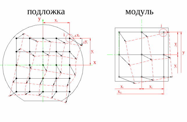 Следует подчеркнуть, что все составляющие, за исключением сдвига, зависят от координат Xj, Уj и Хi,j, Уi,j тестовых структур относительно базовых точек модуля и подложки соответственно: j = 1,2,...,m; i = 1,2,...,n (рис. 1).
