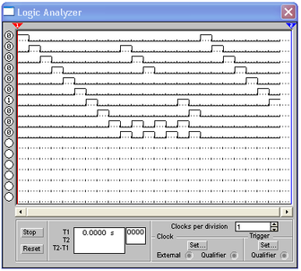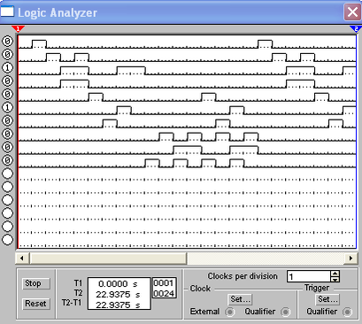 . Срезом входных импульсов T переключается триггер младшего разряда счетчика. Срезом напряжения A0 переключается триггер второго разряда счетчика. Срез сигнала A1 вызывает переключение триггера третьего разряда.