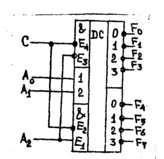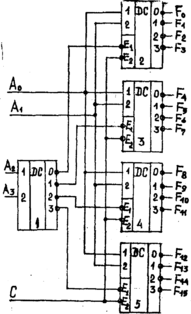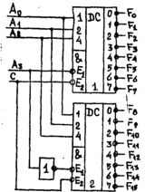 ИМС К155ИД4 – сдвоенный дешифратор с общими адресными входами A0, A1. Первый дешифратор имеет прямой E1 и инверсный E2 стробирующие входа, второй – два инверсных входа E3 и E4. При наращивании дешифратора объединенные входы E1 и E3 являются адресным входом A2, а объединенные стробирующие входы E2 и E4 – входом стробирования (рис.3).