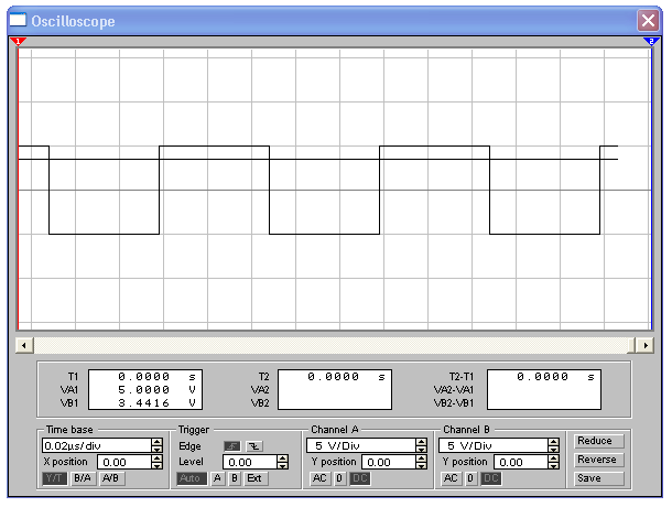 Для изучения эффекта гонок для создания регистра сдвига можно также использовать неидеальный JK-триггер (TTL-LS). С помощью осциллографа наблюдается сигнал на выходе 4-го разряда регистра (Q4 – крайний правый). На рис. 7 а) показаны осциллограммы сигнала на выходе функционального генератора (меандр) и сигнала на выходе 4-го разряда регистра. Наблюдается эффект гонок. При сдвиге по разрядам регистра числа 1111 на выходе 4-го разряда регистра должен представлять собой горизонтальную прямую выше оси абсцисс / оси времени /. Однако на выходе наблюдается импульсный сигнал, по форме напоминающий меандр. Работа регистра сдвига становится неустойчивой – наблюдается эффект гонок.