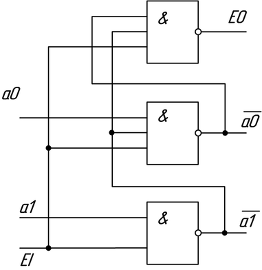 ри подаче стробирующего сигнала EI (Enabled Input) и нажатии клавиши а1 на выходе нижнего конъюнктера получаем сигнал а1, который заблокирует подачу сигналов на входы двух верхних конъюнктеров, таким образом, не зависимо от значения сигнала а0 на выходе а0 будет 1.