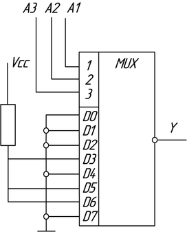 Переключательная функция для 3-х переменных А1-А3 на MUX, имеющем 3 адресных входа (8 входов данных) реализуется путем подачи на соответствующие входы данных 0 или 1.