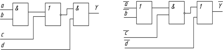 Если все элементы И поменять на ИЛИ, элементы ИЛИ поменять на И, элементы НЕ не менять, входы проинвертировать, полученная схема полученная схема будет выполнять туже функцию, но результат будет проинвертированным.