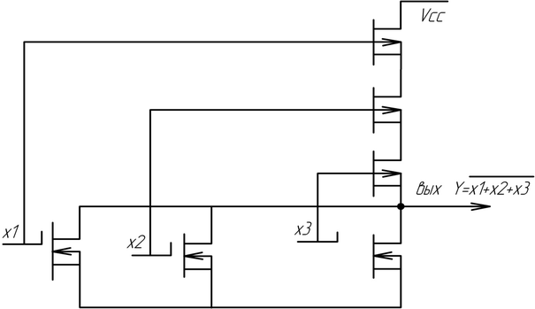 Подача хотя бы одной «1» на любой из входов х1, х2, х3 приведет к тому, что один из верхних транзисторов закроется, а один из нижних откроется, это приведет к появлению на выходе «0».
