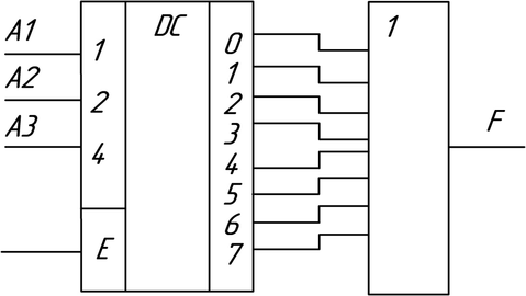 Выходы дешифратора соответствуют единичным значениям переключательной функции подаются на вход ИЛИ.