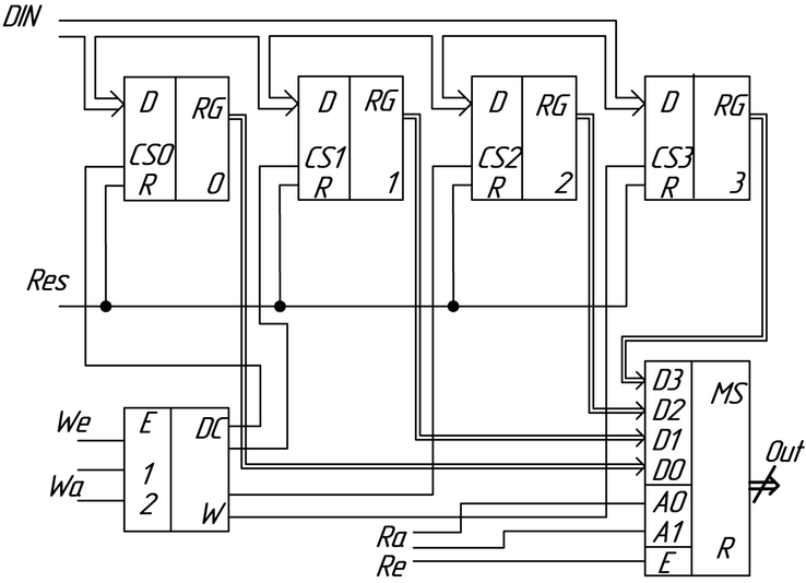 Мультиплексор передает 4-х разрядные данные с одного выбранного регистра на выход Dout