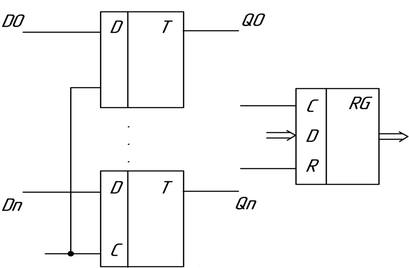 Схема и условное изображение регистра на D-триггерах