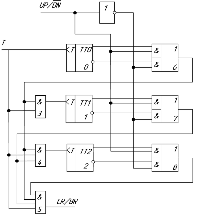 исходном состоянии 001. Подается сигнал DN=0, который через инвертор подключит инверсные выходы триггеров к трактам переноса. На управляющих входах конъюнкторов 3 и 4 будут «1». Подача сигнала «Т» приведет к переключению всех триггеров получаем на выходе 110.