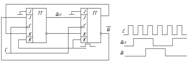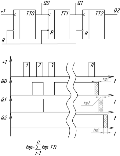 Особенностью этого счетчика является зависимость времени задержки распространения сигнала от комбинации на выходе счетчика, в худшем случае это время равно сумме времен задержки распространения каждого триггера.