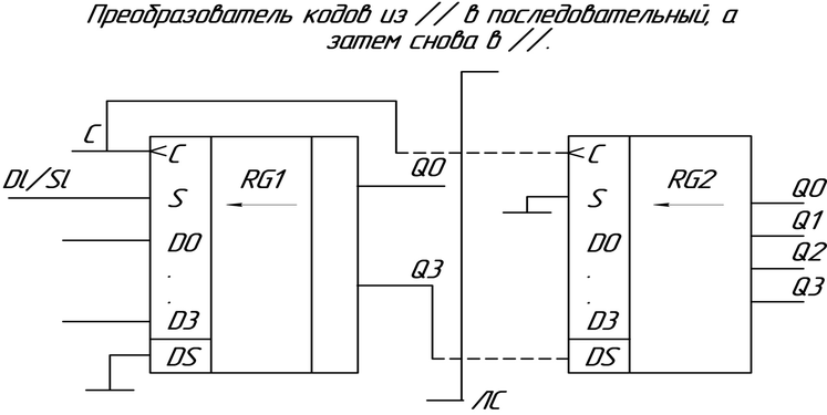 значения Q3; Q2; Q1, которые, пройдя линию связи, через вход регистра RG2 в него вдвигаются и через 4 синхроимпульса «С» займут в нем положение, соответствующее разрядам Q0..Q3, таким образом, данная схема позволяет загружать данные в параллельном коде, преобразовывать в последовательный, и передавать по линиям связи старшим разрядам вперед.