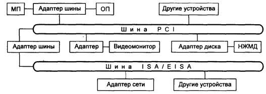 Шина PCI имеет свой адаптер, позволяющий ей настраиваться на работу с любым МП, она позволяет подключать 10 устройств самой разной конфигурации с возможностью автоконфигурирования, имеет свой "арбитраж", средства управления передачей данных.