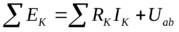 К этой общепринятой записи следует добавить, что со знаком «плюс» в уравнение (2) входят все EK и все произведения RK IK , для которых направления ЭДС и токов (указываемые в схеме стрелками) совпадают с выбранным направлением обхода контура. Формула (2) распространяется и на часть контура, обход по которому обрывается в точке "а" и возобновляется в точке "b". В этом случае в правую часть (2) добавляют напряжение между этими точками Uab