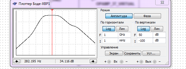 На экране Боде-плоттера в левом верхнем углу есть стрелка-указатель, которую можно перемещаться вдоль горизонтальной оси с помощью мыши, и отмечать необходимые значения частоты f и коэффициента усиления K рис.30 ( f = 282,195 Гц, а K = 34,16 dB).