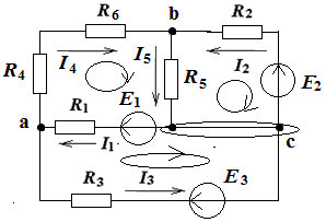 | Определяем количество узлов, ветвей и независимых контуров: q = 3, p = 5, контуров 3. Составляем уравнения по законам Кирхгофа: уравнений по 1-ому закону Кирхгофа равно 2, а уравнений по 2-ому закону Кирхгофа равно 3 для узлов а и b. Для контуров выбираем обходы по часовой стрелке: |