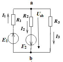 Зададимся направлениями токов произвольно. Запишем уравнение для определения напряжения между узлами. Потенциал φa > φb и задаемся направлением напряжения от а к b. |