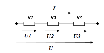 | Rэкв = R1+R2+R3 I = E/R экв U = U1+U2+U3 = R1·I + R2·I + R3·I =Rэкв∙I |