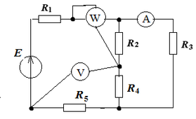 Определить показания приборов схемы рис 1, если R1 = 5 Ом, R4 = 8 Ом, R5 = 4 Ом, R3 = 6 Ом, R2 =2 Ом, Е = 100 В.