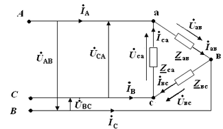 Линейные токи определяются по фазным токам по первому закону Кирхгофа: