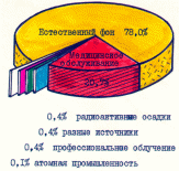 Человек всегда подвергался воздействию ионизирующей радиации различных внешних или внутренних естественных источников. Это космические и гамма-лучи, радон и другие вещества, выделяемые горными породами и строительными материалами, природные радиоактивные вещества, попадающие в организм. На рис. 15.14 показана доля атомной энергетики в годовой дозе облучения населения Великобритании, которая составляет всего 0,1%.