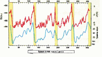 Рис. 15.19. Динамика изменения уровня океана и температуры за последние 400 тыс. лет