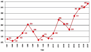 Рис. 15.21. Рост суммарного числа случаев опасных гидрометеорологических явлений за 1991 – 2005 гг.