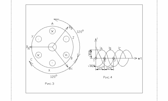 По правилу буравчика направление векторов магнитной индукции BА, ВВ, ВС. Но они получаются посредством 3-х фазного тока, сл-но меняются во времени по sin.